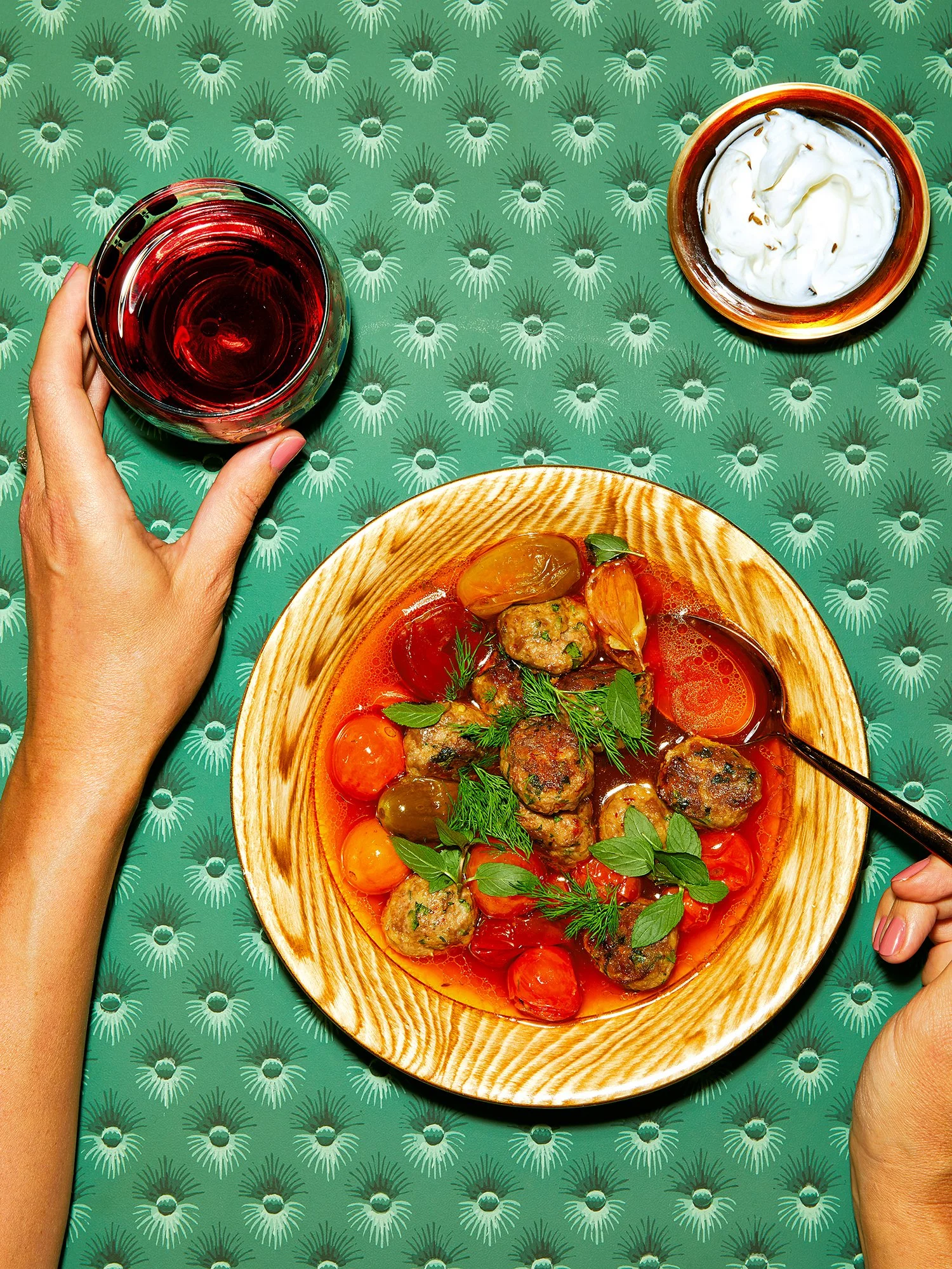 Serve the meatballs over orzo or pearled couscous in bowls and spoon the tomato confit broth over the top. Scatter with herbs and pass the yogurt at the table to spoon on top.